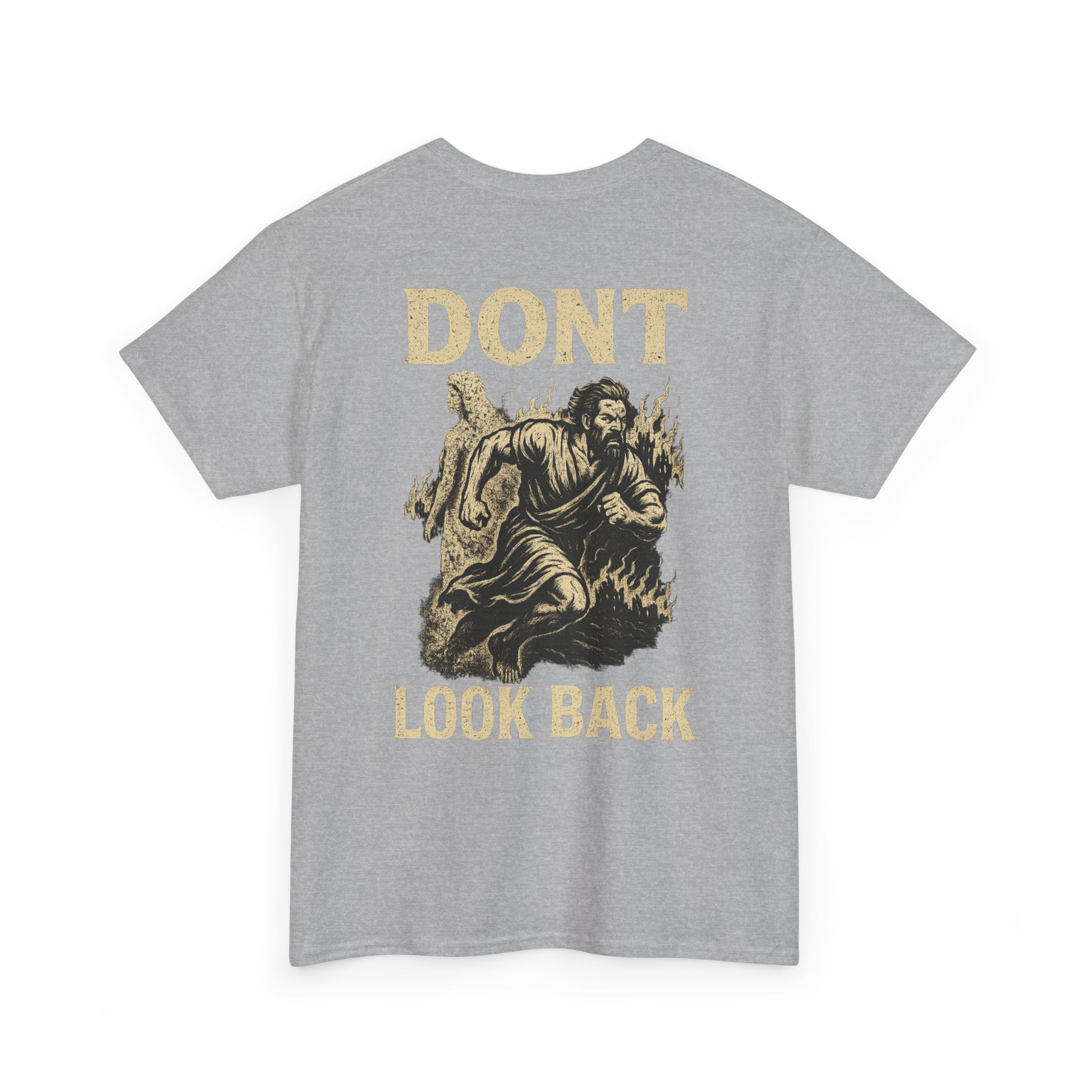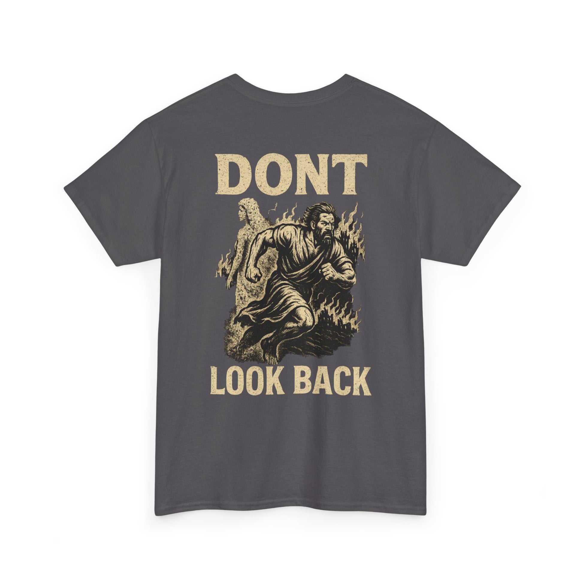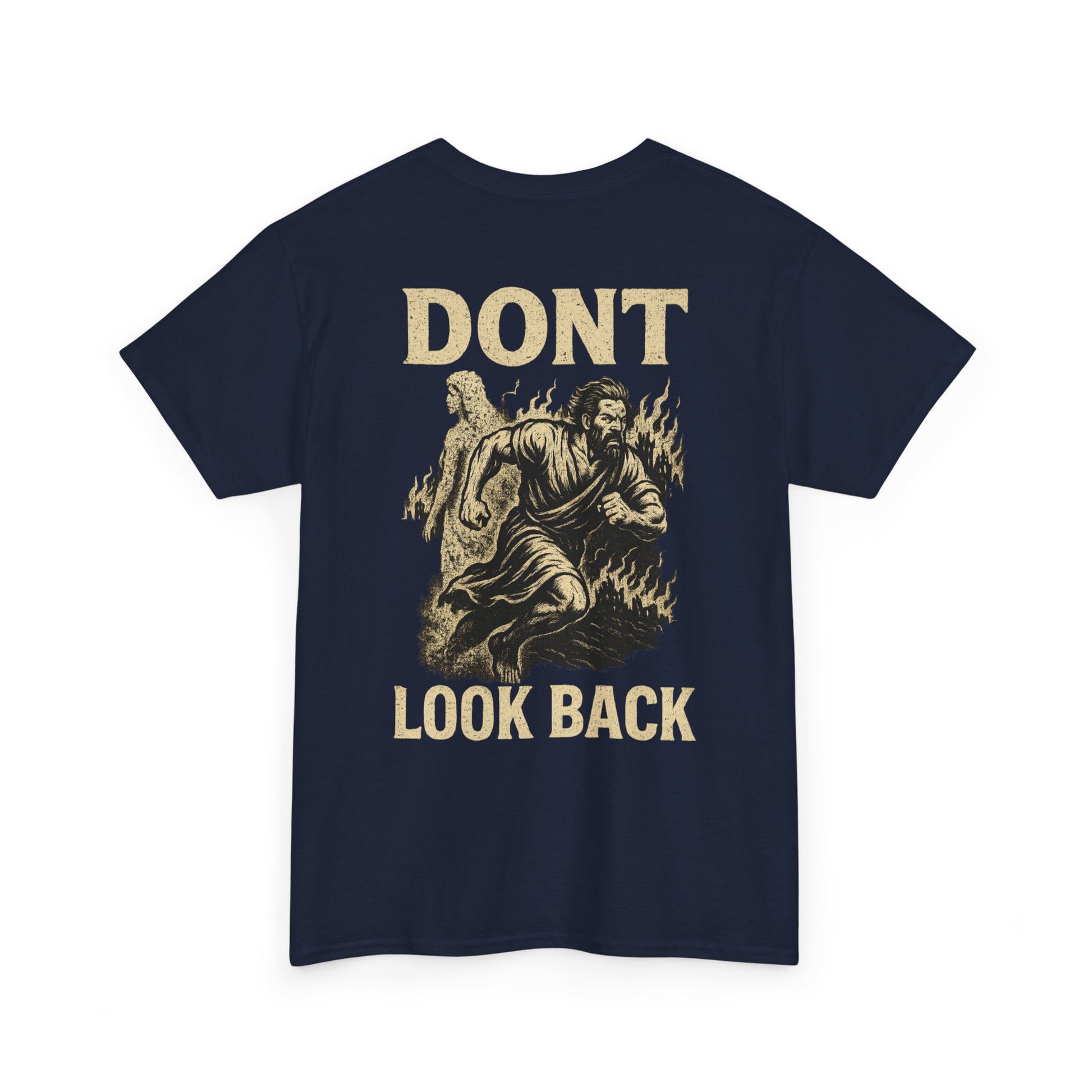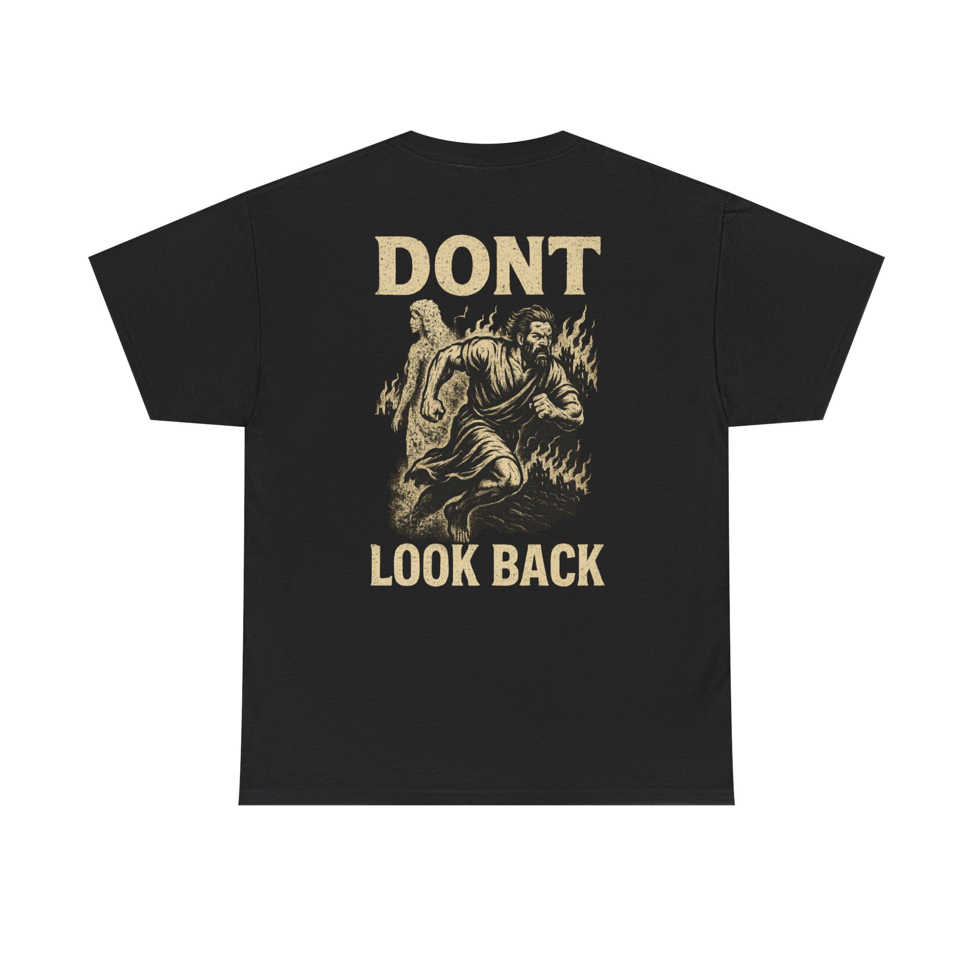 This shirt features a bold back graphic inspired by the story of Lot—capturing the moment he runs from the burning city while his wife turns into a pillar of salt. The powerful words “DON'T LOOK BACK” frame the scene in a gritty, vintage style that feels tough, masculine, and unapologetically Christian.