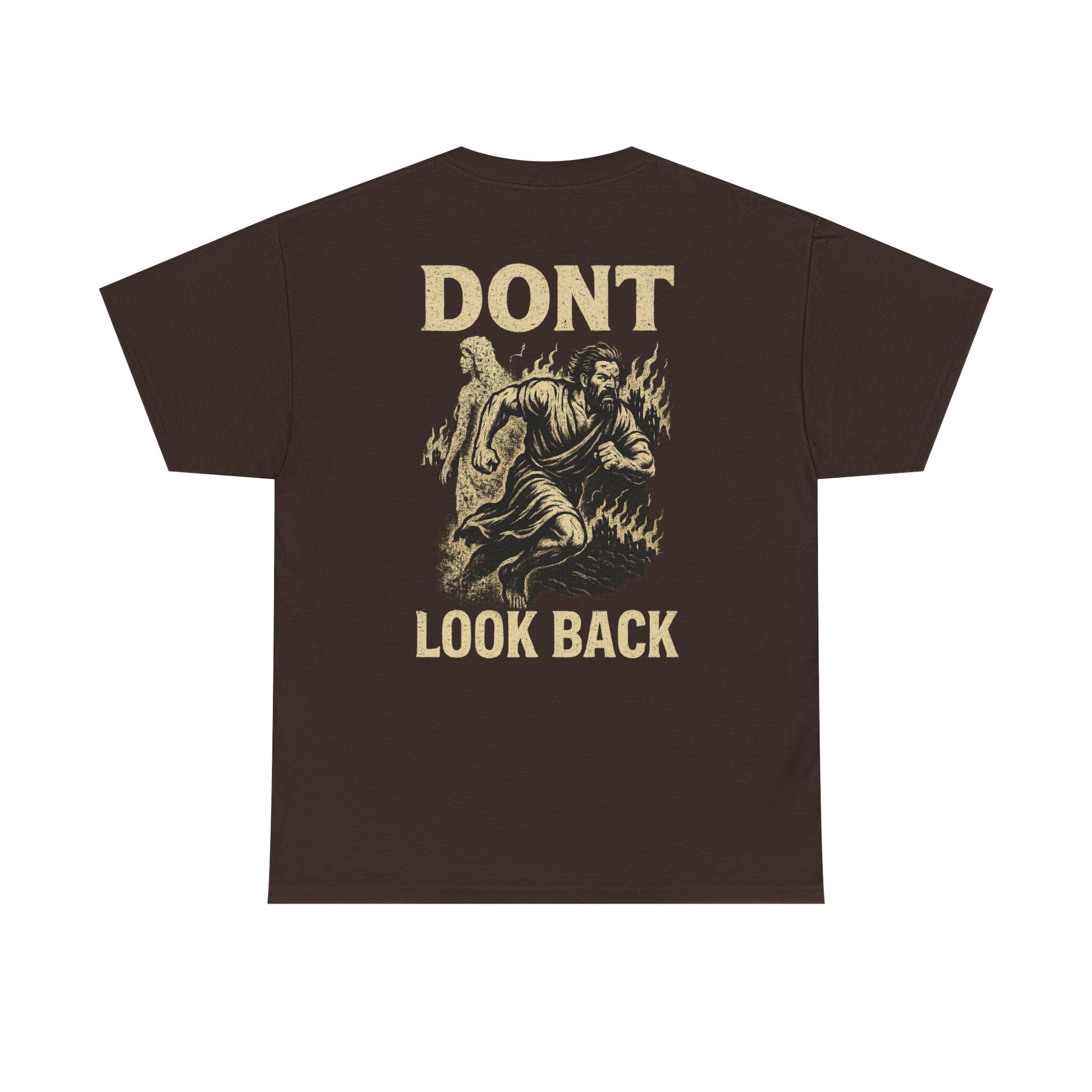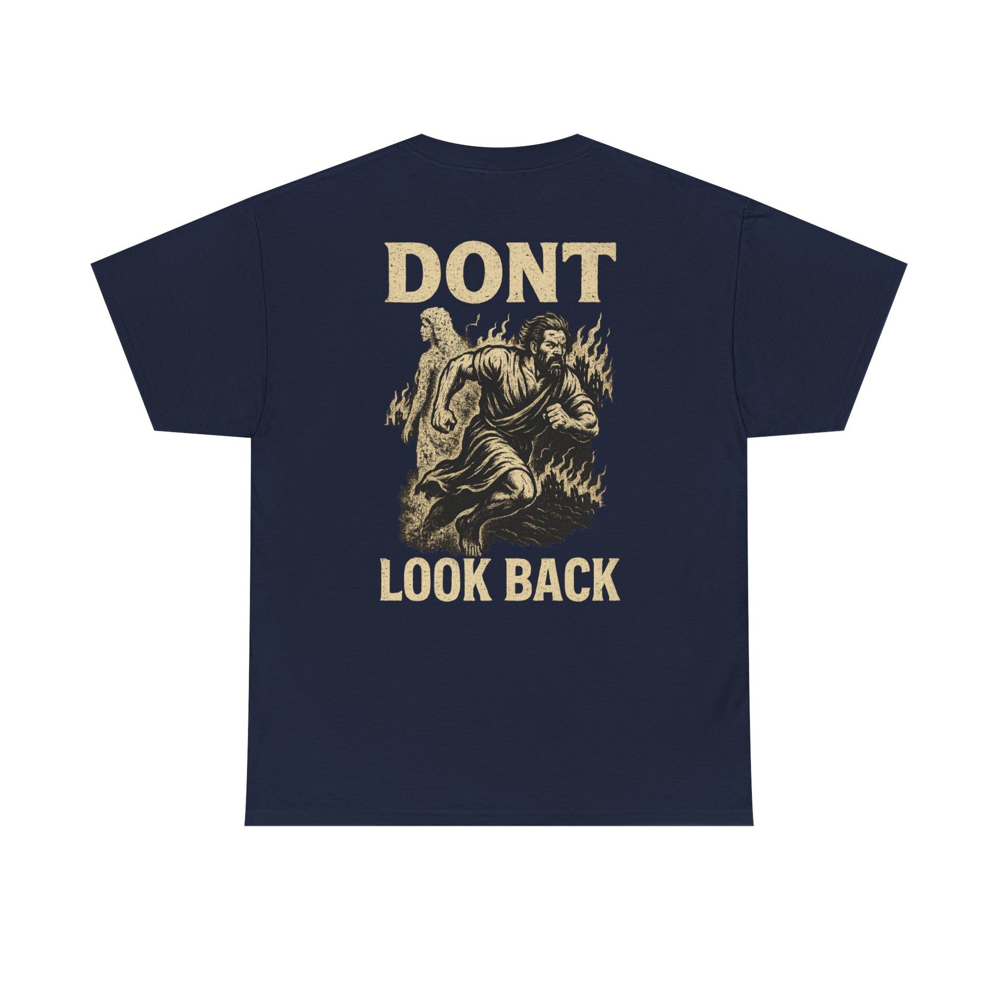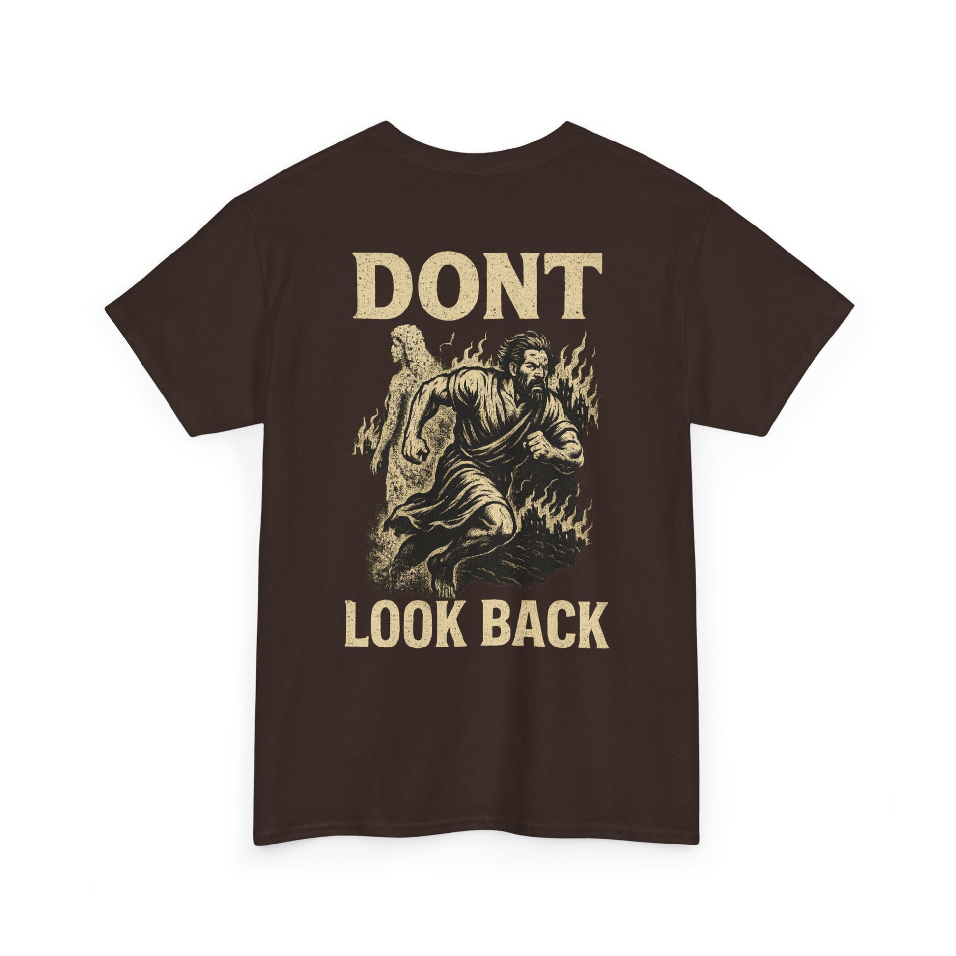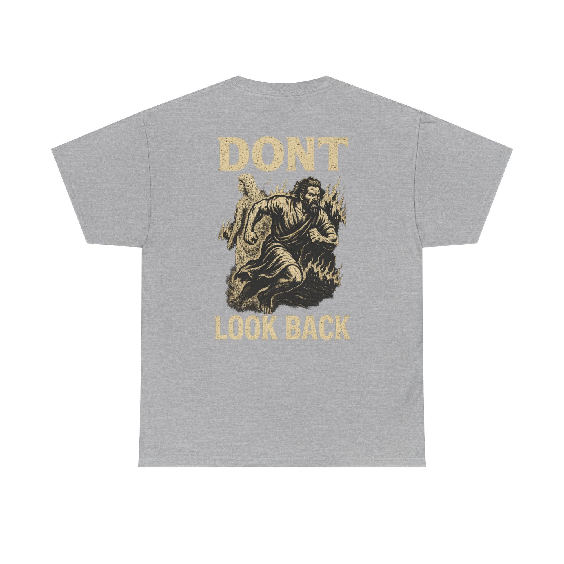 This shirt features a bold back graphic inspired by the story of Lot—capturing the moment he runs from the burning city while his wife turns into a pillar of salt. The powerful words “DON'T LOOK BACK” frame the scene in a gritty, vintage style that feels tough, masculine, and unapologetically Christian.