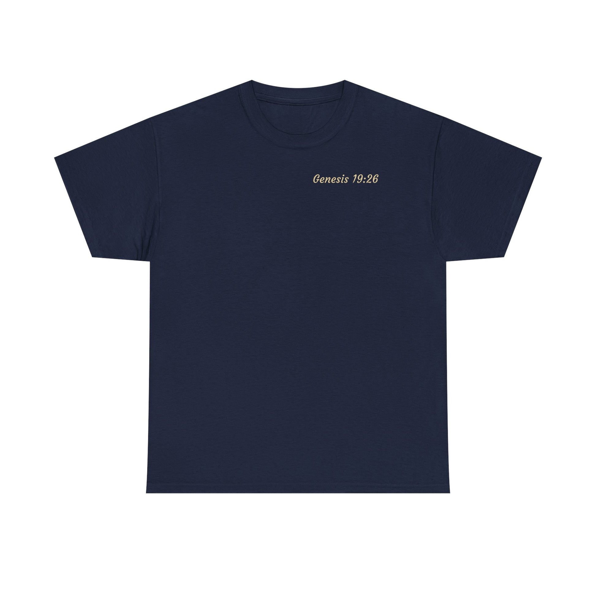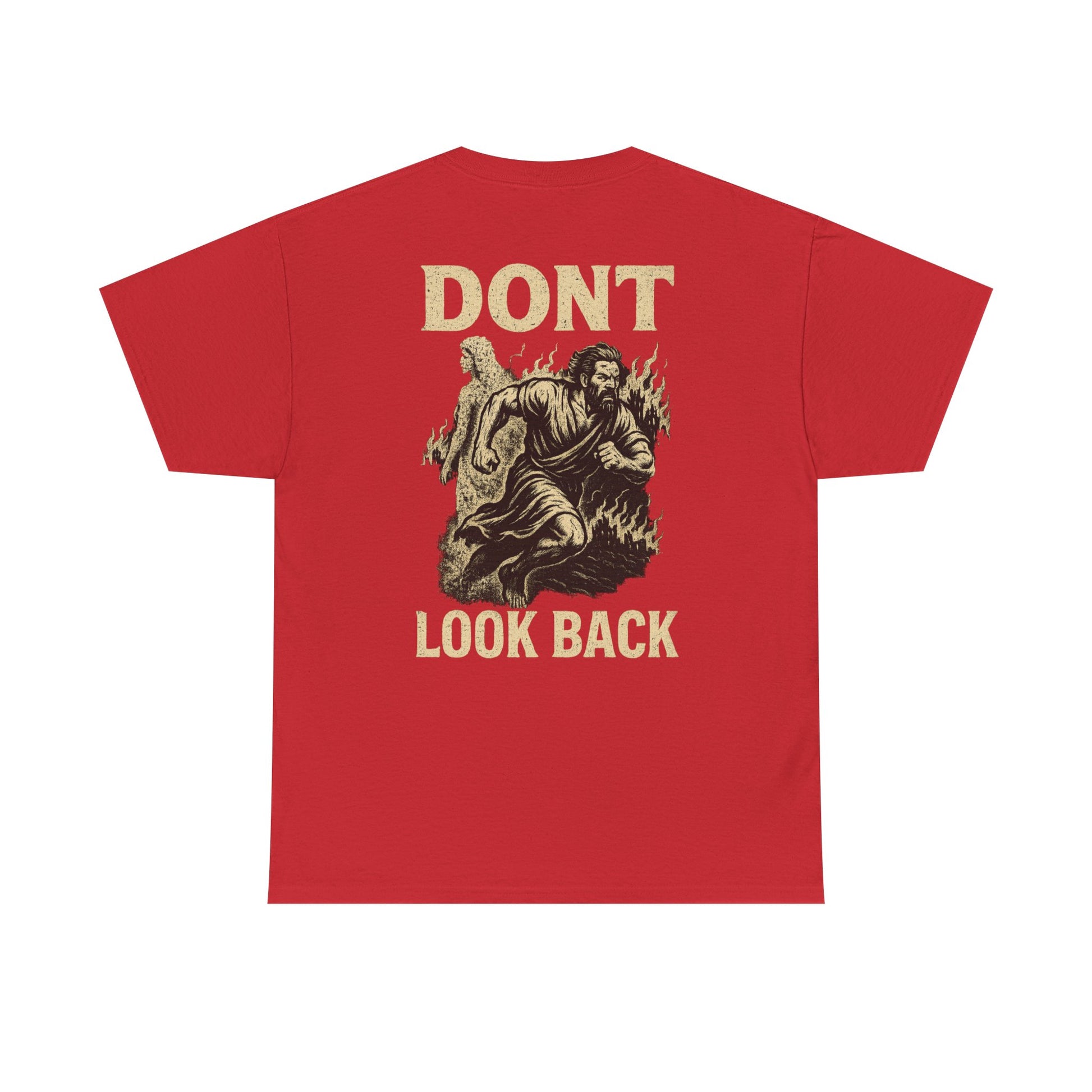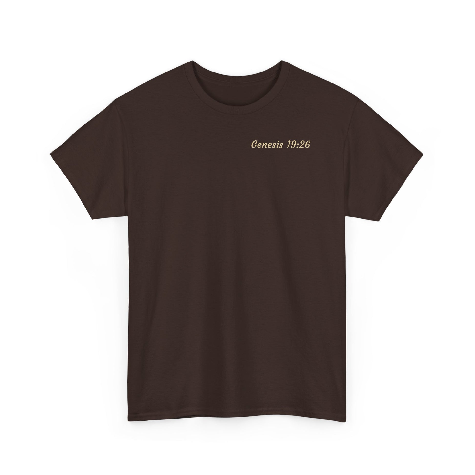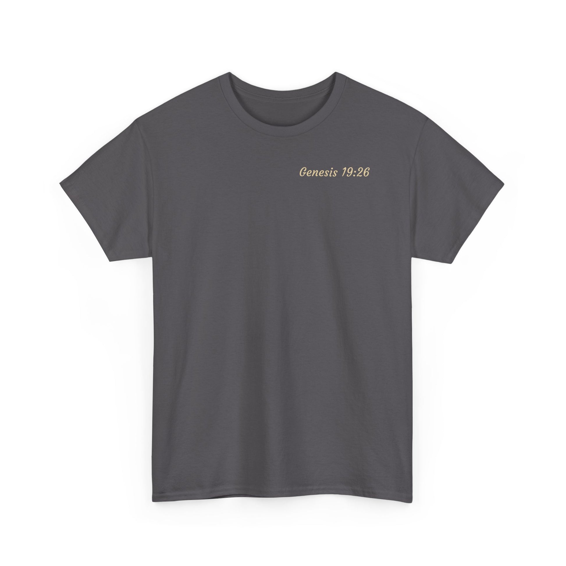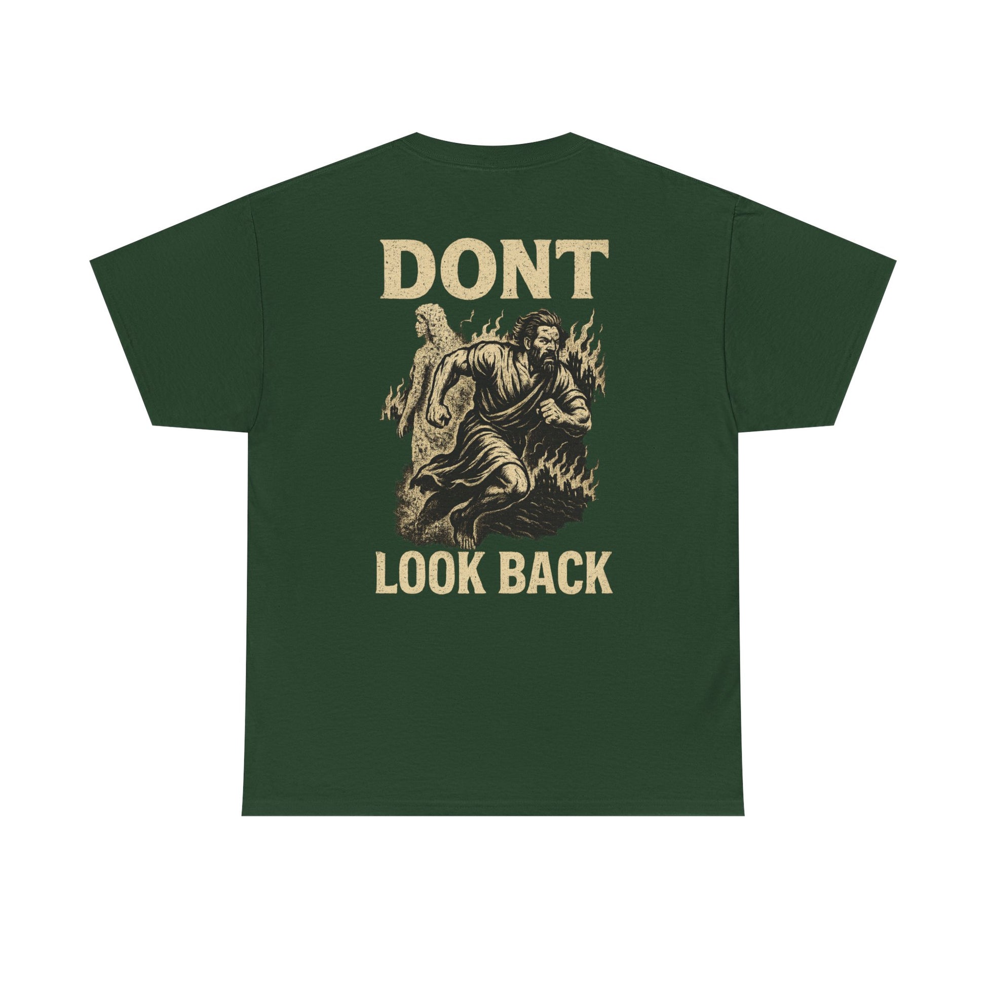 This shirt features a bold back graphic inspired by the story of Lot—capturing the moment he runs from the burning city while his wife turns into a pillar of salt. The powerful words “DON'T LOOK BACK” frame the scene in a gritty, vintage style that feels tough, masculine, and unapologetically Christian.