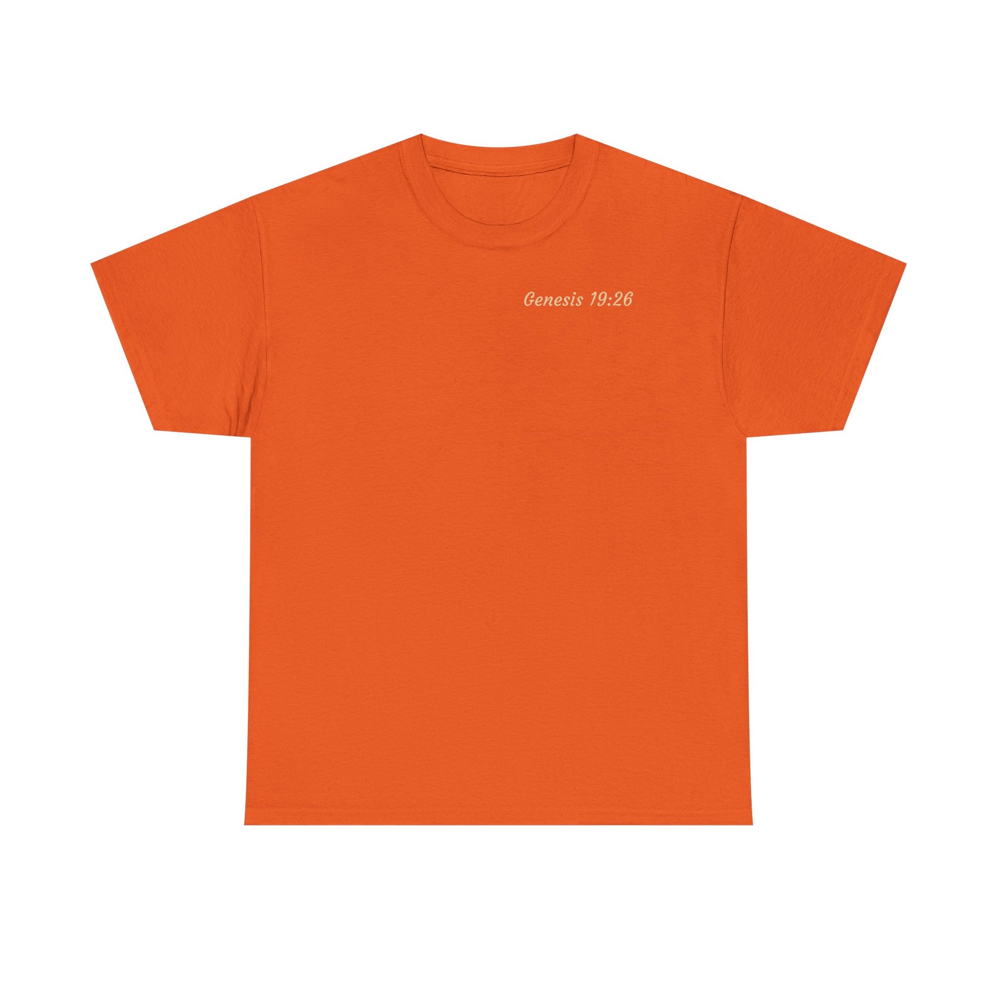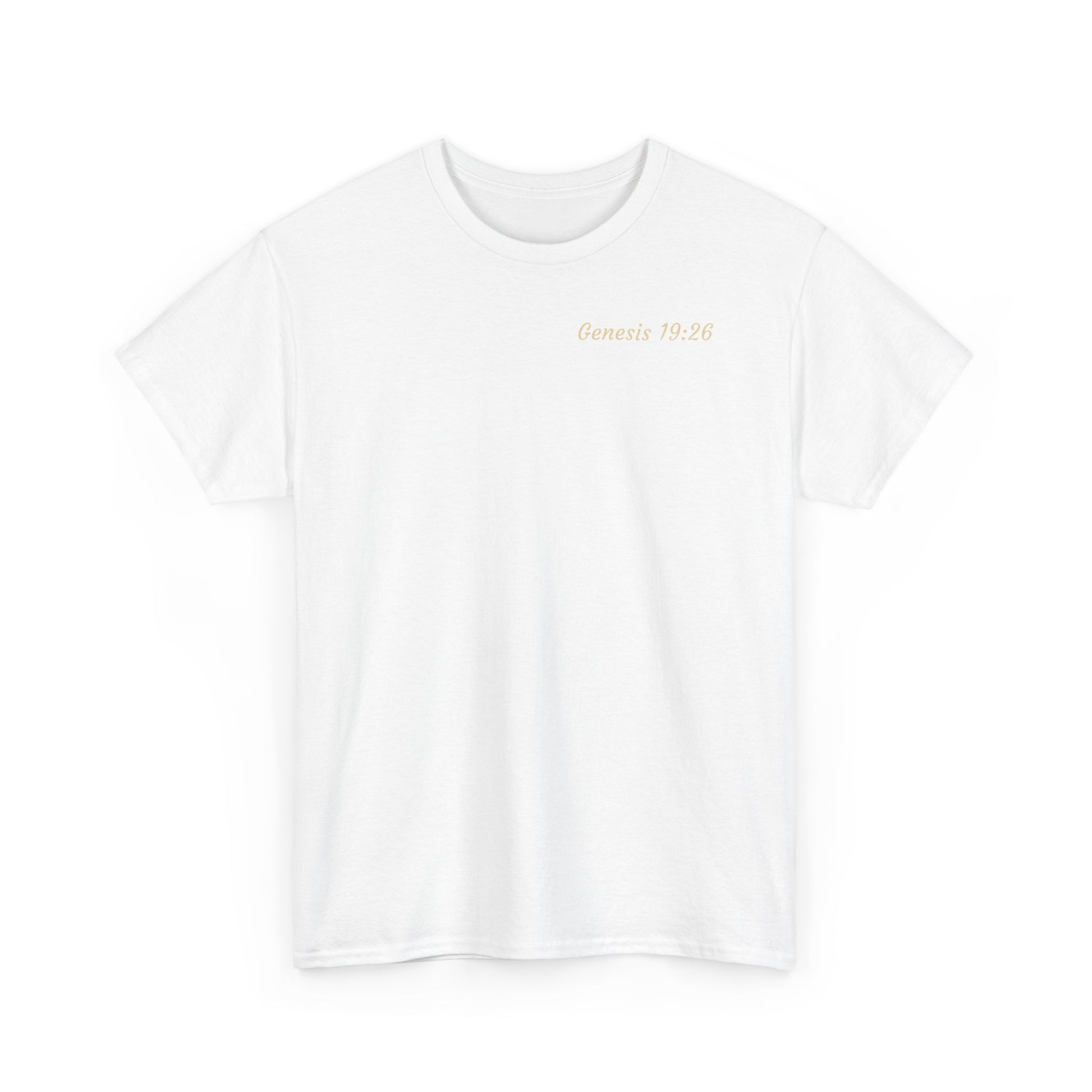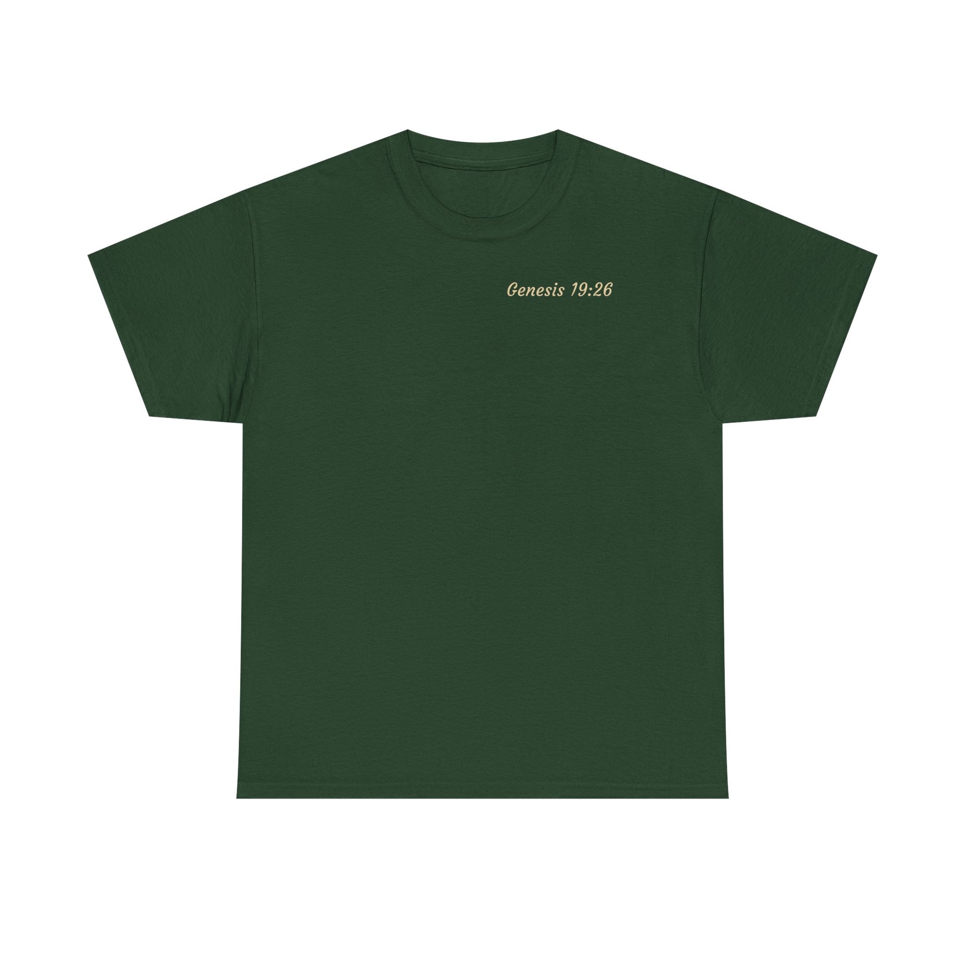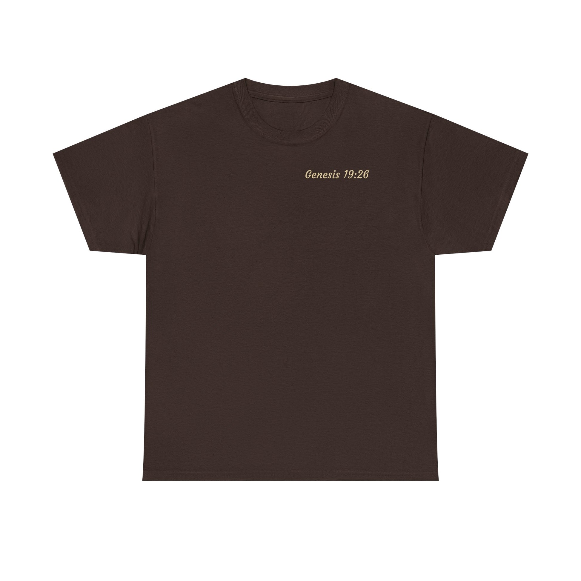 This shirt features a bold back graphic inspired by the story of Lot—capturing the moment he runs from the burning city while his wife turns into a pillar of salt. The powerful words “DON'T LOOK BACK” frame the scene in a gritty, vintage style that feels tough, masculine, and unapologetically Christian.
